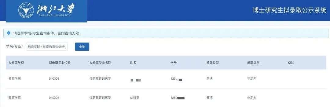 直播吧06月30日讯 6月30日,浙江大学公布2025年秋季博士研究生拟录取名单,其中,乒乓球名将刘诗雯被拟录取为浙江大学教育学院体育教育训练学博士,录取类型为普博,录取类别为非定向。