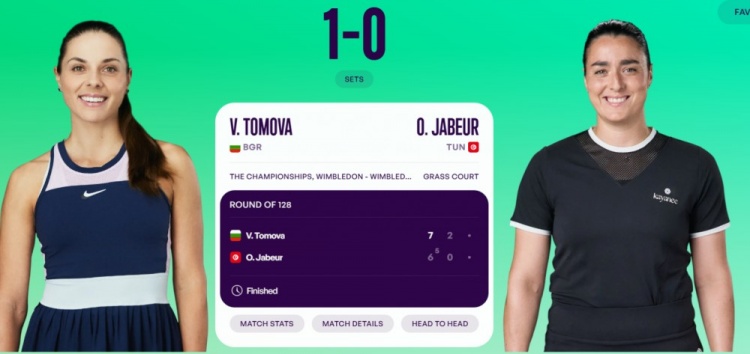 直播吧6月30日讯 在刚刚结束的温网女单首轮中,两届赛会亚军贾巴尔在先失一盘的情况下因伤退赛,托莫娃晋级女单第二轮。