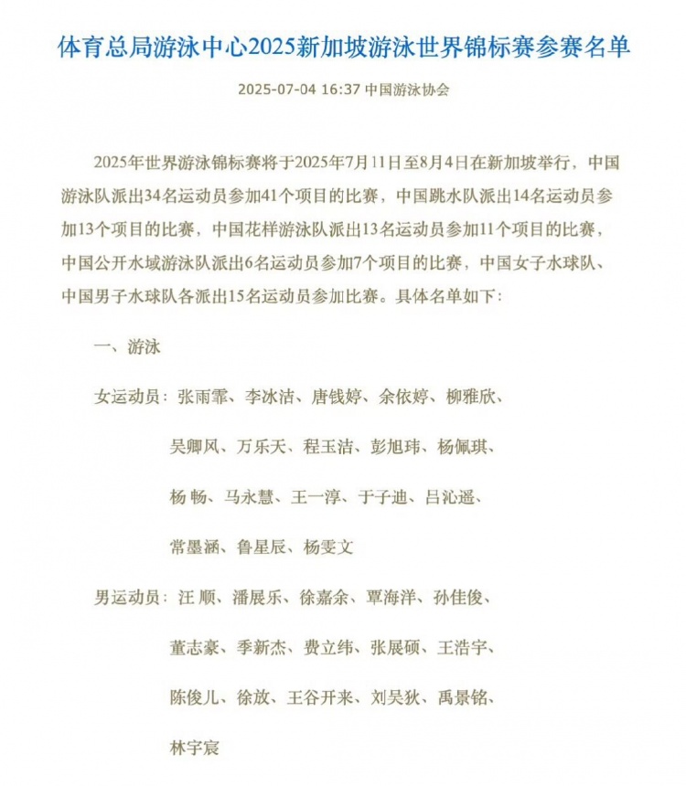直播吧7月4日讯 游泳世锦赛本月底在新加坡展开争夺,中国游泳队公布了本次比赛参赛名单。