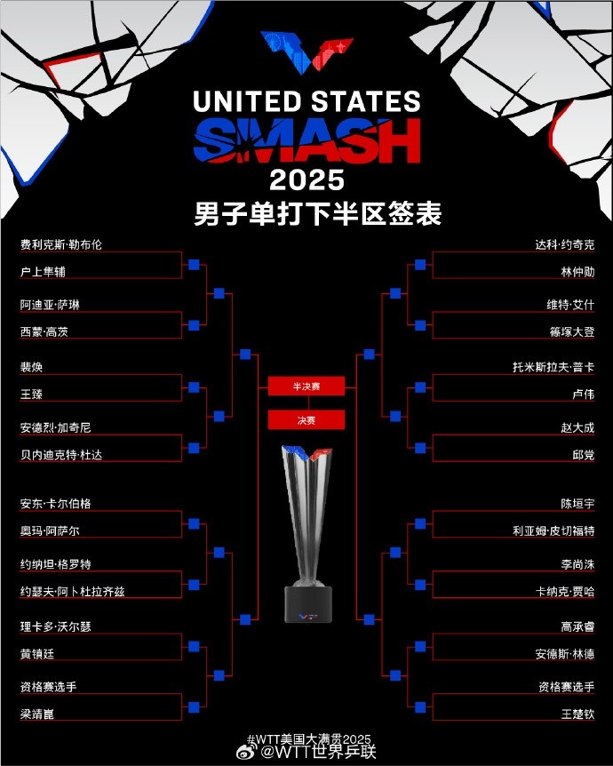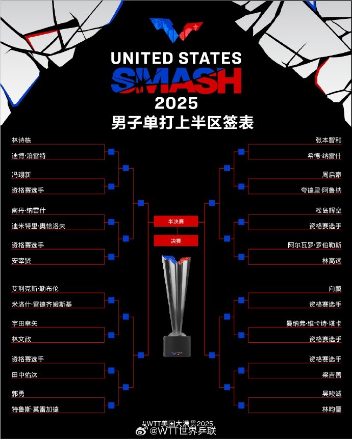 直播吧7月5日讯 WTT美国大满贯抽签结果出炉,国乒选手林诗栋和王楚钦分别镇守上下半区。