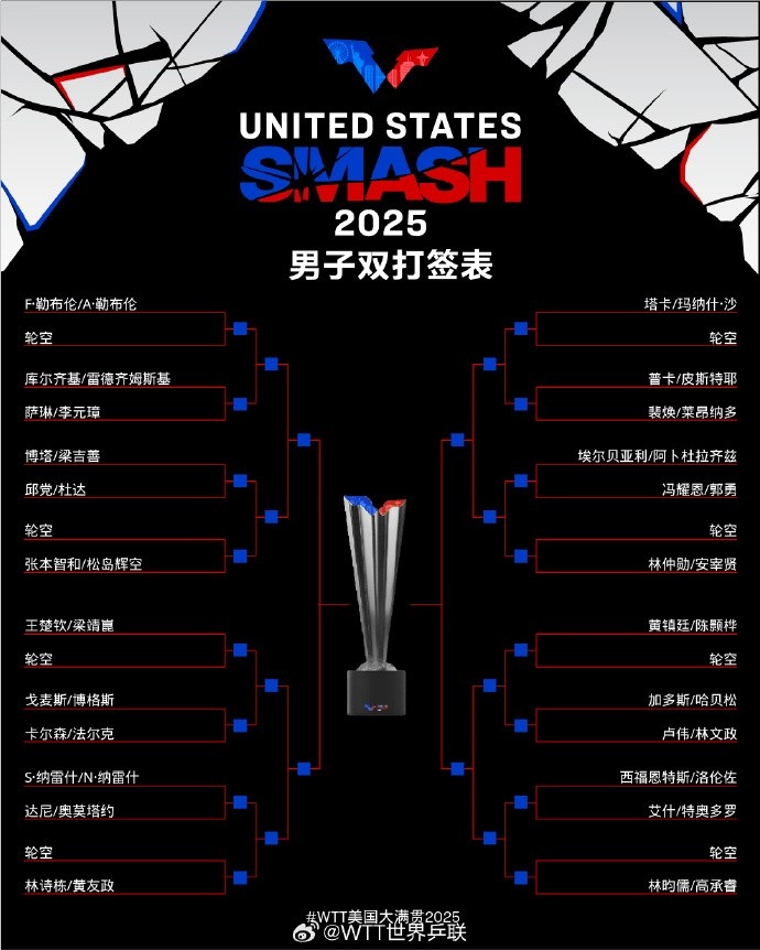 直播吧7月5日讯 WTT美国大满贯男双签表出炉,中国两对组合首轮轮空。