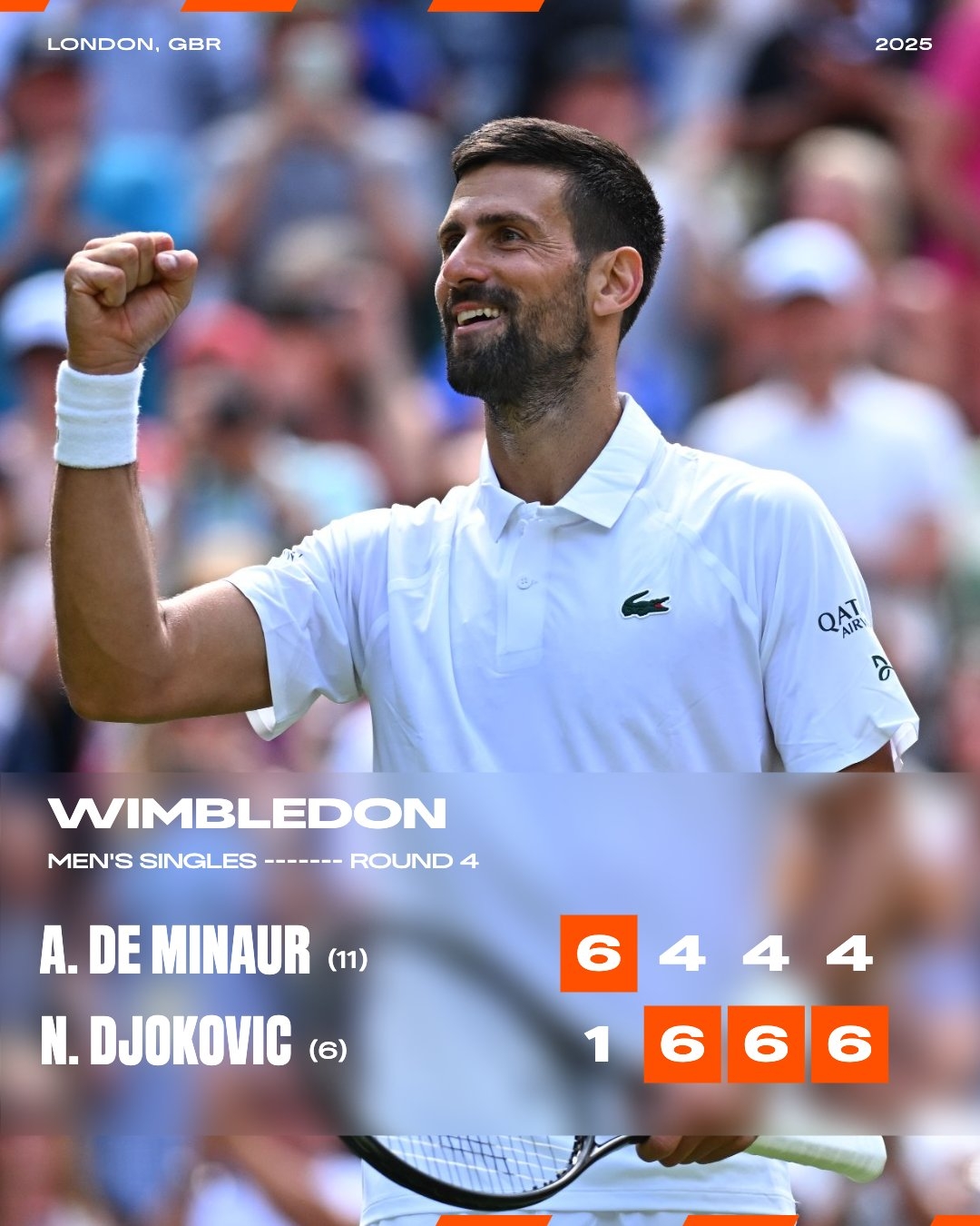 直播吧07月07日讯 在刚刚结束的温网男单第四轮中,七届赛会冠军德约科维奇经过四盘苦战战胜赛会11号种子德米纳尔,晋级8强,取得温网男单101胜。