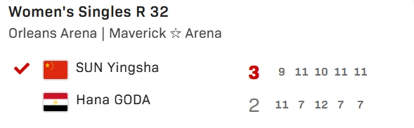 孙颖莎本场两度落后,两次扳平大比分,决胜局11-7胜出晋级16强。