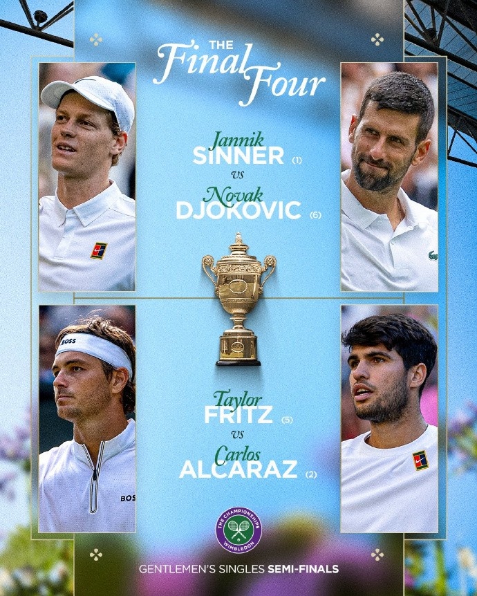 温网男单四强全部产生,分别为:阿尔卡拉斯、辛纳、弗里茨、德约科维奇。