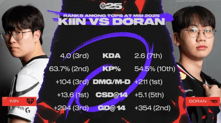 直播吧7月10日讯 2025MSI胜决T1vsGEN赛前,LOL赛事官推分享两队上单数据对比。