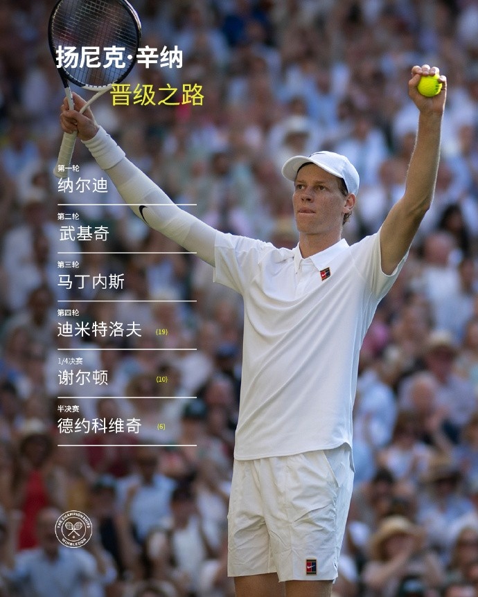 本届温网,辛纳5场比赛都以3比0的比分取胜,在面对迪米特洛夫的比赛中,他在0-2落后的情况下幸运收获了对手的退赛大礼。
