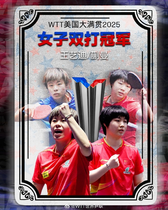 直播吧7月13日讯 在刚刚结束的WTT美国大满贯女双决赛中,中国选手王艺迪/蒯曼3-2击败队友孙颖莎/王曼昱,夺得本站女双冠军。