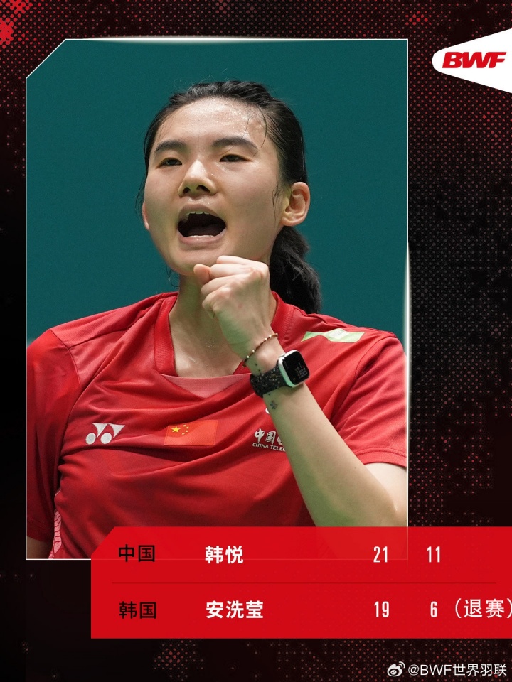 第一局,韩悦21-19拿下胜利,第二局韩悦11-6领先进入技术间歇,随后安洗莹受伤无法坚持选择退赛,韩悦1-0晋级决赛。她也终结了面对安洗莹的五连败。