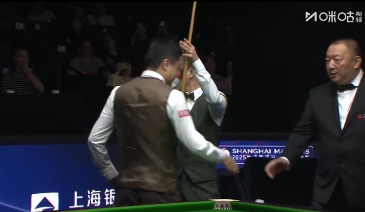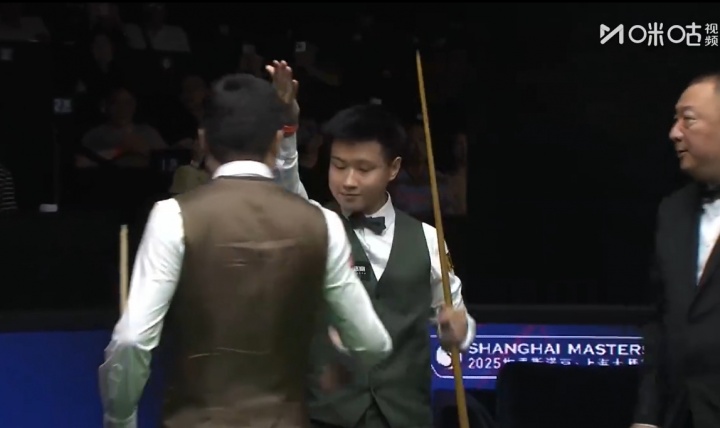 比赛结束后,赵心童与丁俊晖握手后,示意现场观众为其鼓掌。