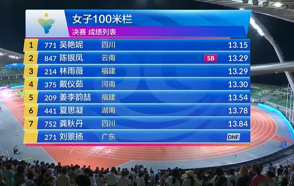 而前半段领跑的刘景扬则是在比赛中摔倒,遗憾没有做出成绩,夏思凝以13秒78获得第6。