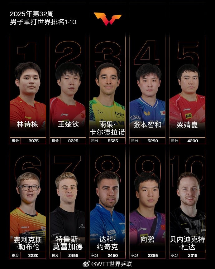 男单方面,林诗栋排名第一,王楚钦排名第二,巴西选手雨果-卡尔德拉诺排名第三,张本智和排名第四,梁靖崑排名第五,小勒布伦排名第六,莫雷加德排名第七,达科排名第八,向鹏排名第九,杜达排名第十。