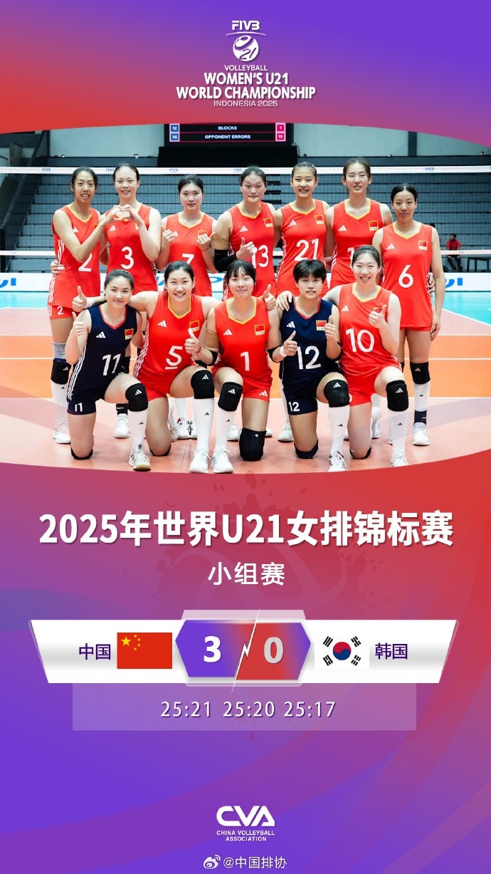 三局比分:25-21、25-20、 25-17。中国队获得世锦赛两连胜,韩国队两连败。
