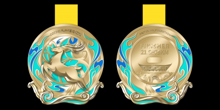 奖牌正面环绕奖牌的色彩元素更换为了深蓝、碧蓝两色,似南海湿地阳光下倒映深蓝天空的水天一色,又似微风拂过湖面时的碧波荡漾,勾勒出"塞上西湖"的流动诗意。背面则以东河走西口历史文化街区的包头城楼镌刻城市印记,城楼两侧,是“包头”两个苍劲大字,充分体现历史厚重感。