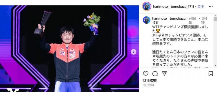 张本智和在个人社媒写道: