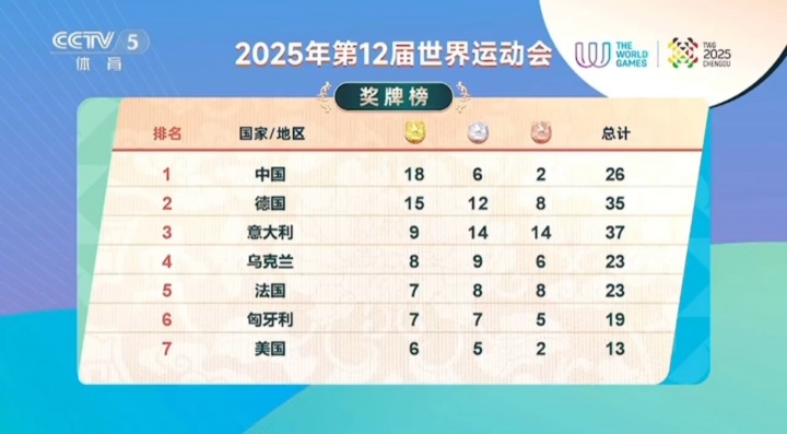 成都世运会奖牌榜: