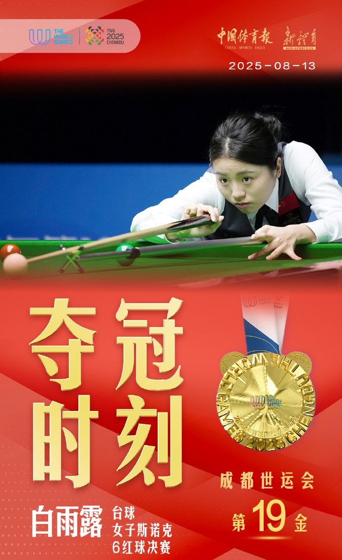 2025年成都世运会台球女子斯诺克6红球决赛,中国选手白雨露2-0击败泰国选手那鲁差夺得金牌,这也是中国体育代表团本届赛事第十九枚金牌!