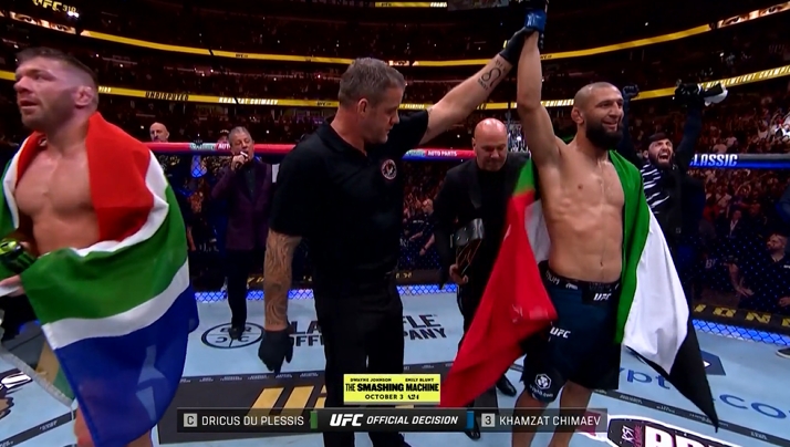 直播吧08月17日讯 UFC319主赛中量级冠军战,奇马耶夫挑战新晋冠军杜普莱西斯。最终裁判一致判定奇马耶夫50-44击败杜普莱西斯,夺得中量级冠军,延续职业生涯全胜战绩。