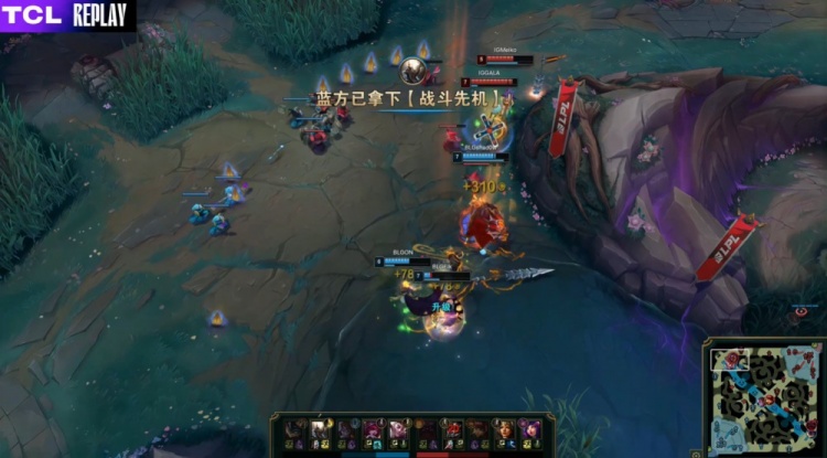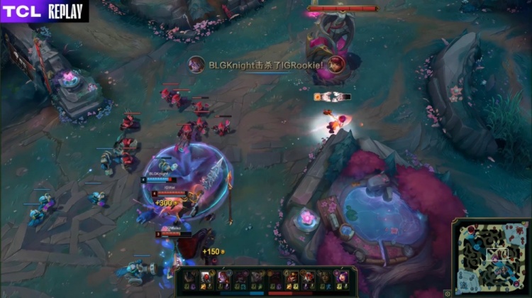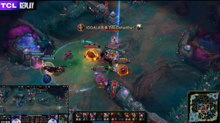 第一局前期双方打野各路gank,Wei皇子上路EQ失误被留下人头,BLG逐渐积累起2k经济优势。小龙团knight阿萝拉爆斩三杀,BLG打出1换3。
