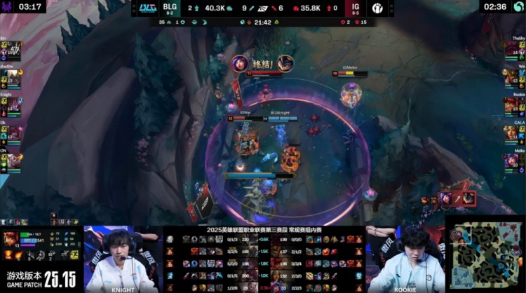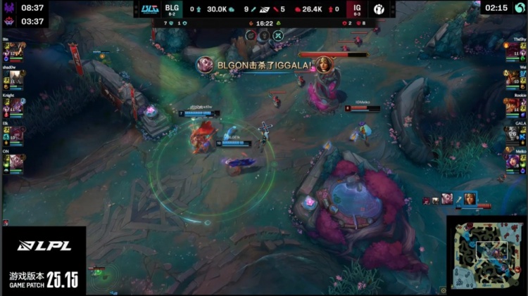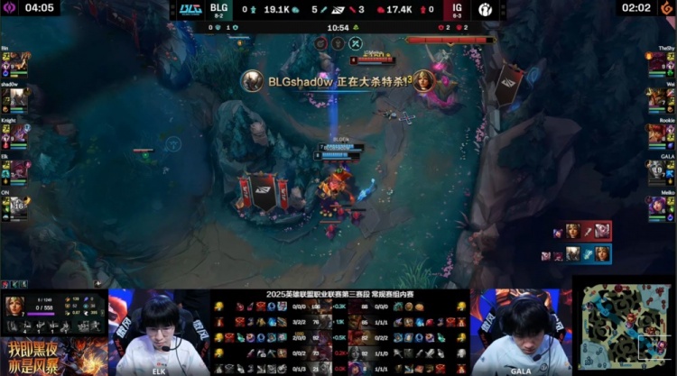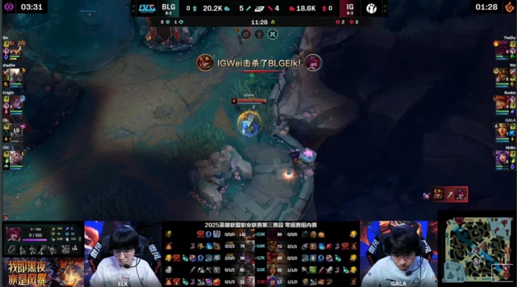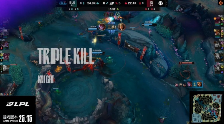 中期knight上路送GALA一千大米,中路团Meiko妮蔻推推棒大招开BLG三人,但阿Bin兰博进场轰出三杀,BLG打出2换4吃掉大龙,经济领先8k。
