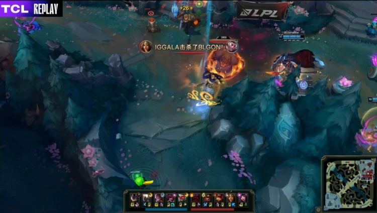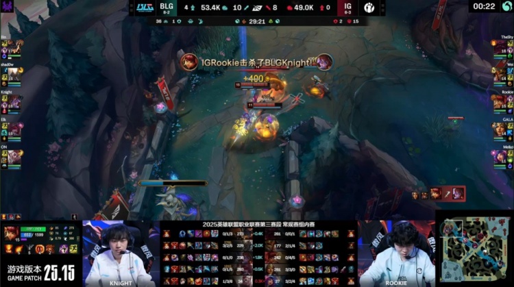 【21:40】iG三人上路越塔击杀Bin大哥,knight阿萝拉来上反手单杀Rookie安妮,GALA收掉残血knight拿到一千大米,BLG打出1换2,经济领先4k。