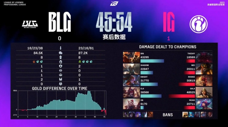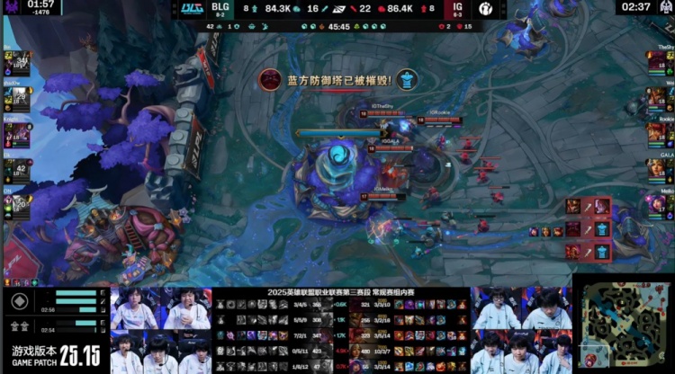 最终iG下路推进逮捕Bin大哥,BLG再吃大龙但大势已去,iG水龙加持上路融化BLG,Wei千里追击knight将其单杀,iG推平BLG基地先下一城。