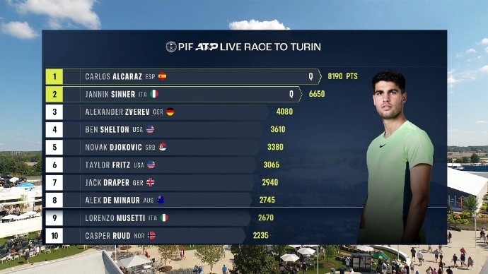 本站过后,ATP年终总决赛的积分也已经更新,阿尔卡拉斯和辛纳锁定年终总决赛名额。前8名入围年终总决赛,德约科维奇目前排在第五,鲁德和穆塞蒂要为总决赛名额发起冲击。