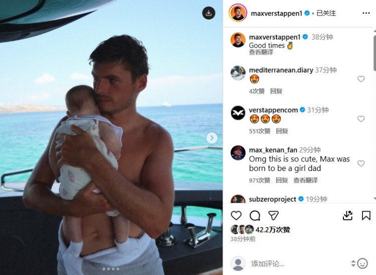维斯塔潘晒出了自己与女儿的照片,并配文写道:美好时光。他在今年5月迎来了女儿莉莉的出生。