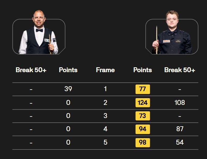 斯坦-穆迪打出108、87、54分,直落五局以5-0零封巴里-霍金斯,晋级八强,刷新职业生涯最好成绩。