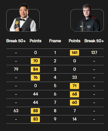 亚伦-希尔首局打出137分破百,并在1-3落后张安达的情况下连追三局率先拿到赛点,第8局张安达单杆63挽救一个赛点追到决胜局。