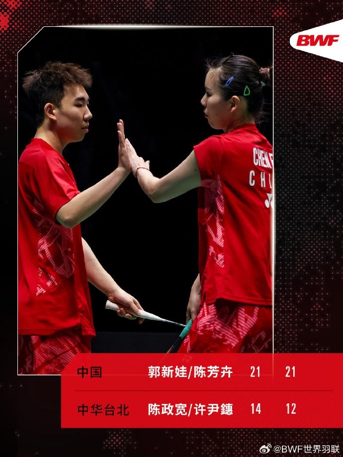 郭新娃/陈芳卉直落两局击败对手,顺利晋级下一轮,下轮将战杨博轩/胡绫芳。