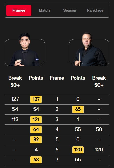 斯佳辉打出单杆127、54、113分,以4-1领先马奎尔率先到达赛点,第六局马奎尔冲击147,然而未能打进黄球,比分停留在120分。制胜局中,斯佳辉抓住机会完成逆转,最终斯佳辉5-2马奎尔,晋级武汉公开赛八强!