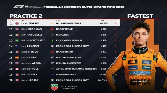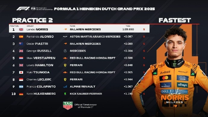 直播吧8月29日讯 2025F1荷兰大奖赛二练成绩,诺里斯1:09.890最快,阿隆索落后0.087第二,皮亚斯特里第三。拉塞尔、维斯塔潘、汉密尔顿、角田裕毅和勒克莱尔排在第四到第八位。第九和第十是科拉平托和霍肯伯格。