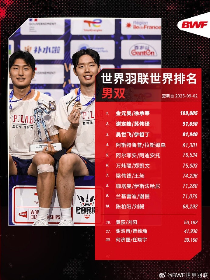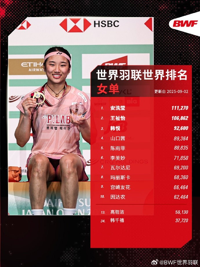 直播吧9月3日讯 羽毛球世锦赛结束全部争夺,世界羽联更新最新一期世界排名。
