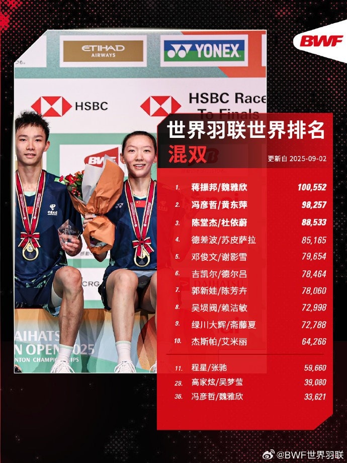 国羽在男单、女双、混双项目上保持世界第一,其中石宇奇领跑男单、刘圣书/谭宁女双世界第一、蒋振邦/魏雅欣混双世界第一。
