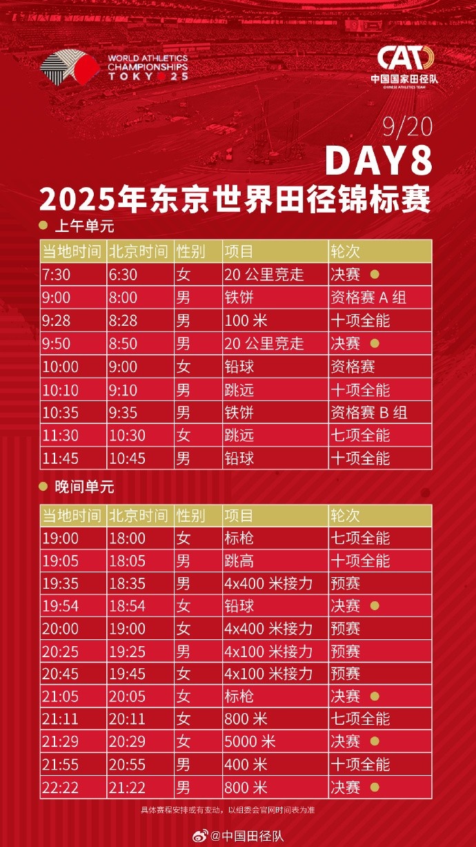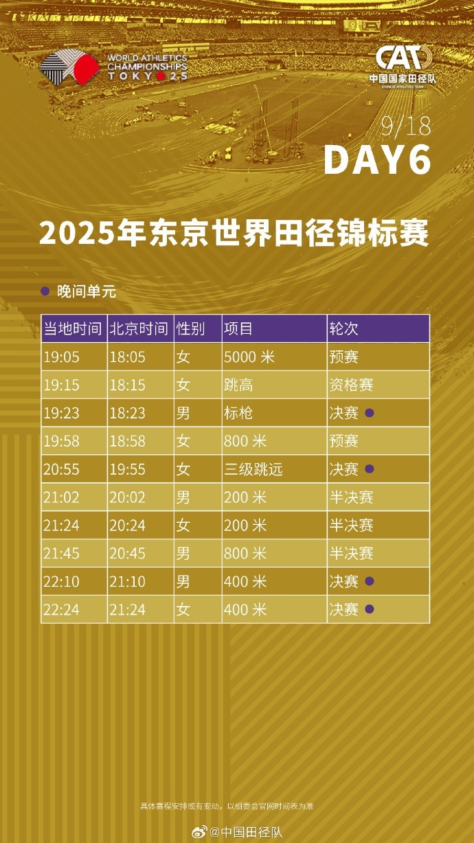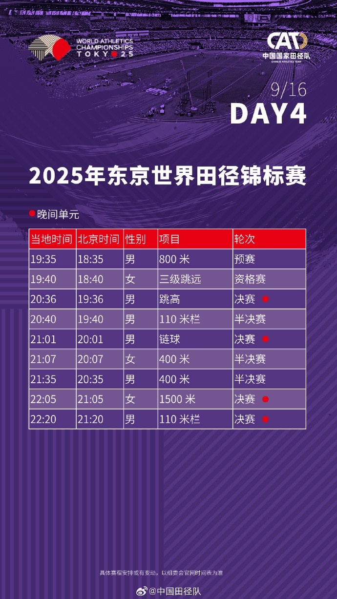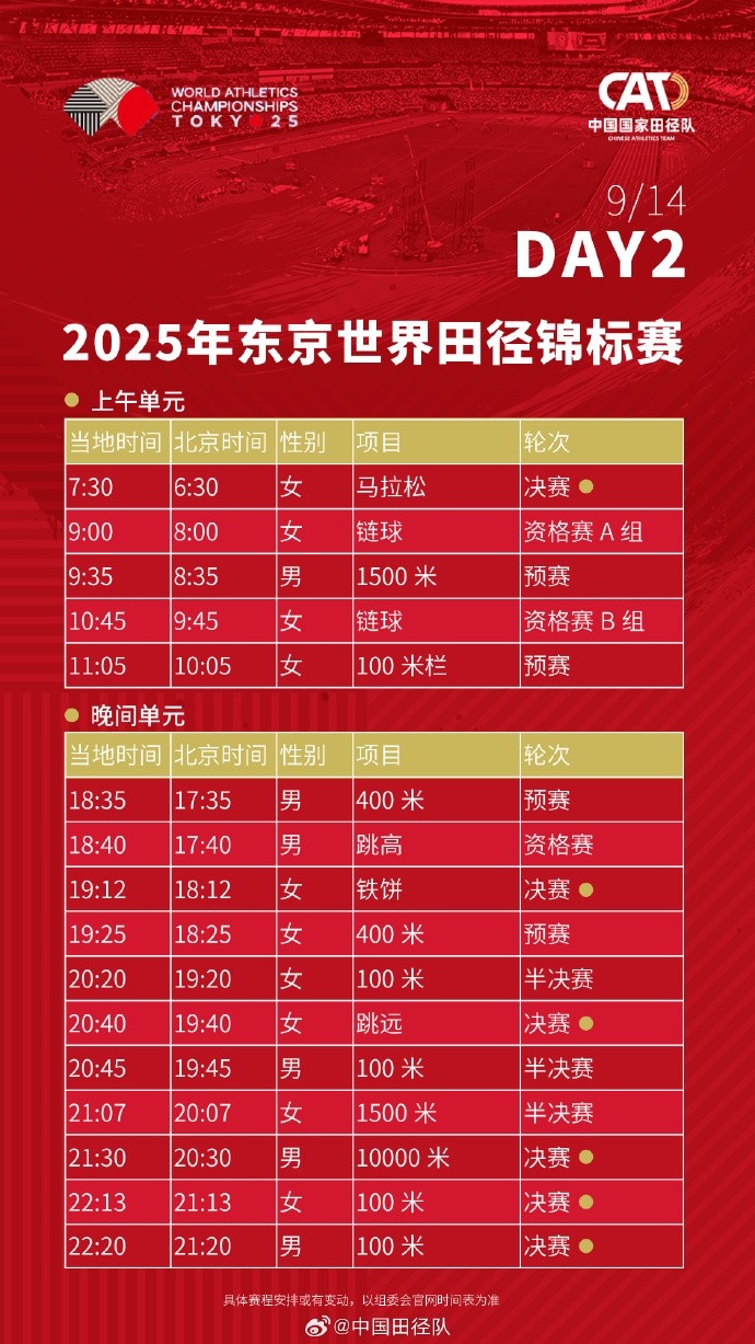 直播吧9月12日讯 2025东京田径世锦赛赛程出炉,男子100米决赛将于北京时间9月14日晚上21:20进行。