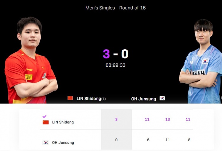 本站男单1/8决赛,林诗栋对阵吴晙诚,经过3局较量,林诗栋3-0【11-6、13-11、11-8】击败对手晋级8强,他将在1/4决赛对阵安德斯-林德,后者在1/8决赛中淘汰了陈垣宇。