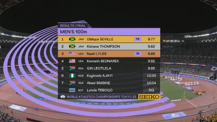 直播吧09月14日讯 2025年东京田径世锦赛男子百米飞人大战,塞维尔后程逆转,9秒77刷新PB首夺世锦赛冠军,汤普森9秒82银牌,卫冕冠军莱尔斯9秒89铜牌。