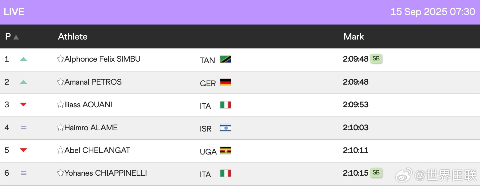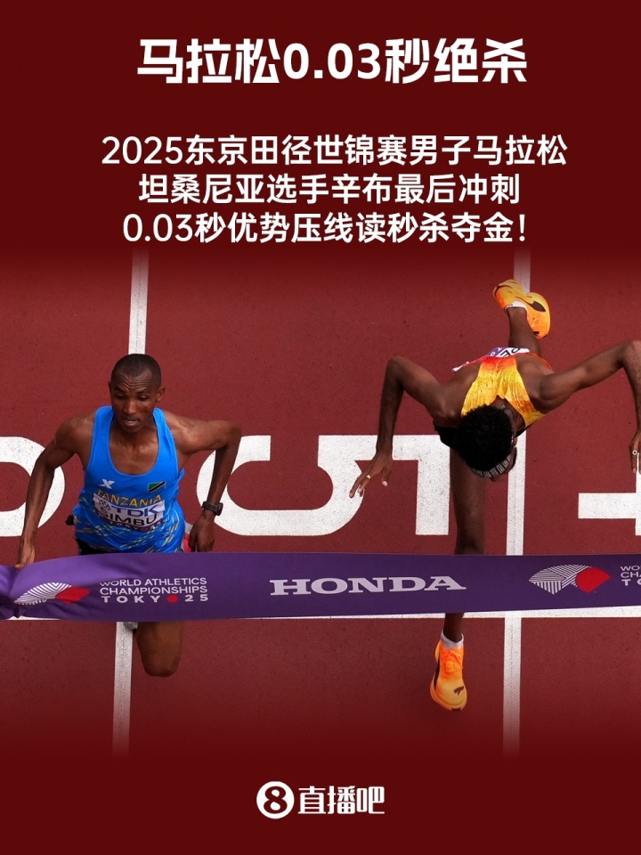 直播吧09月15日讯 2025年东京田径世锦赛男子马拉松决赛上演神剧情,坦桑尼亚选手辛布凭借最后的冲刺,以0.03秒优势压线读秒绝杀夺金!前二的成绩都是2:09:48。