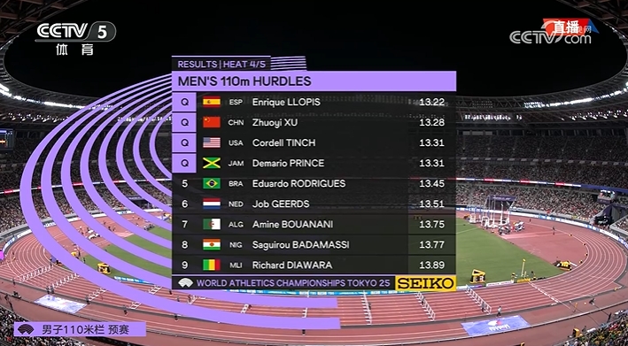 直播吧09月15日讯 2025东京田径世锦赛,男子110米栏预赛,中国选手徐卓一在第四组第6道亮相,最终他以13秒28获得小组第二,直接晋级半决赛。