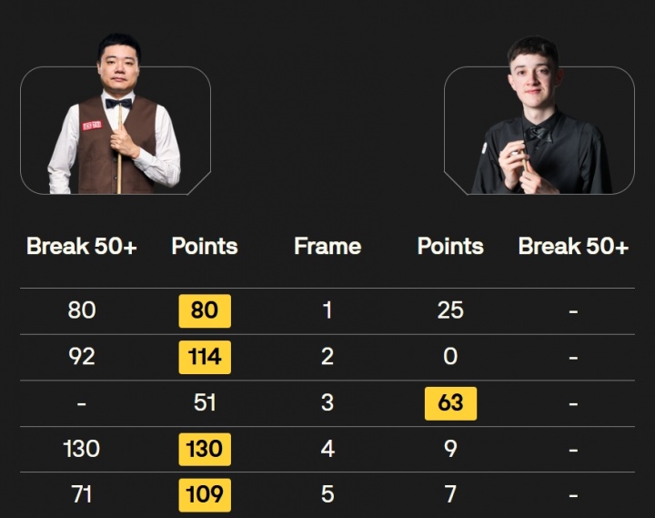 直播吧09月15日讯 斯诺克英格兰公开赛第3轮,丁俊晖打出单杆80、92、130、71分,以4-1的比分战胜利普伦,成为首位晋级32强的选手。