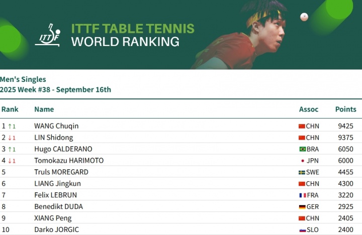 国际乒联最新一期男单世界排名,王楚钦以9425分超越林诗栋,重返世界第一!巴西选手雨果超越张本智和,升至世界第三。莫雷加德第五,梁靖崑第六,小勒布伦第七,向鹏第九。