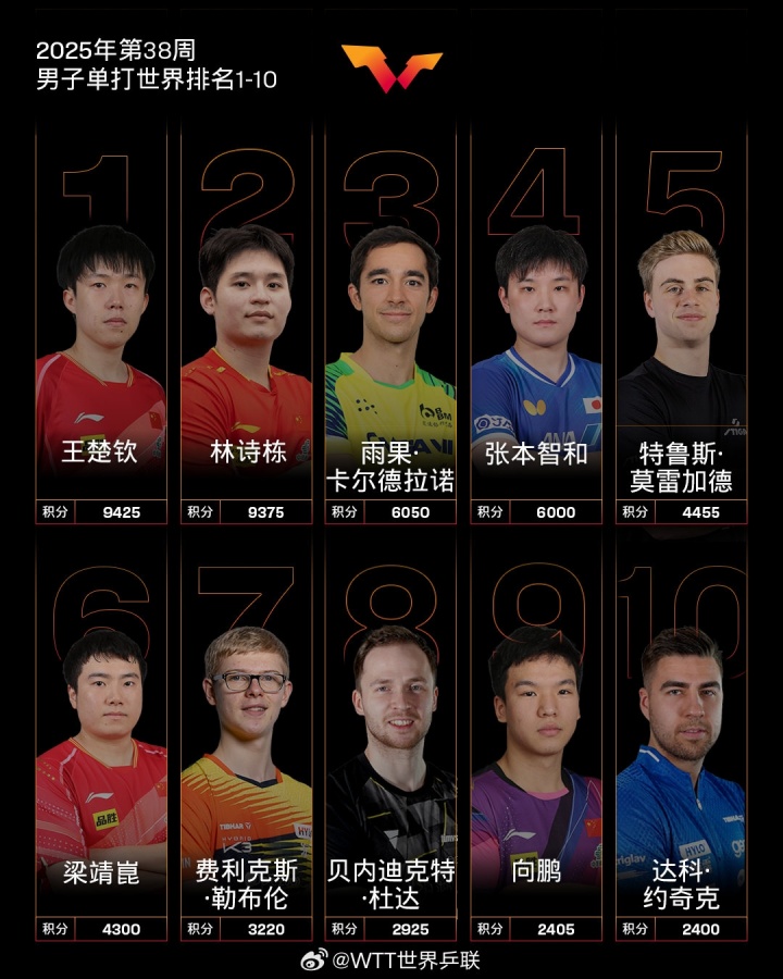 直播吧09月16日讯 国际乒联公布最新的男单世界排名(2025年第38周),在WTT冠军赛中国澳门站夺冠的王楚钦时隔7个月重返世界第一!