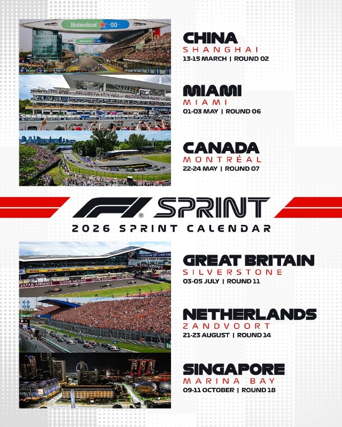 直播吧9月16日讯 F1官方公布2026年冲刺赛赛程,明年共有6场冲刺赛,中国站为首场赛事。