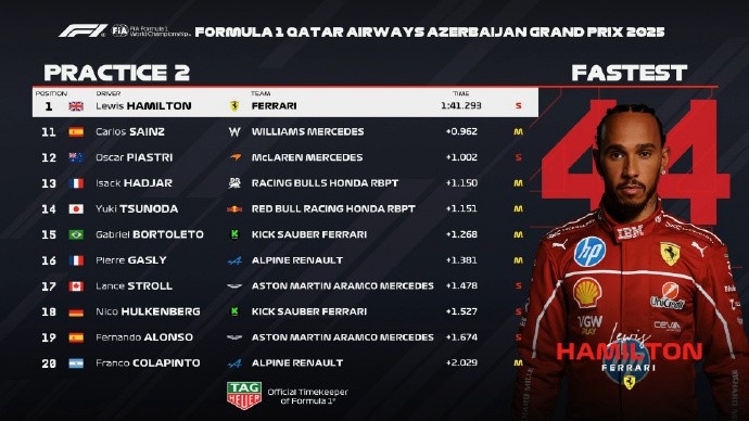 直播吧9月19日讯 F1阿塞拜疆站二练结束,法拉利车手汉密尔顿以1:41.293的成绩全场最快,勒克莱尔微弱差距第二,法拉利包揽前二。