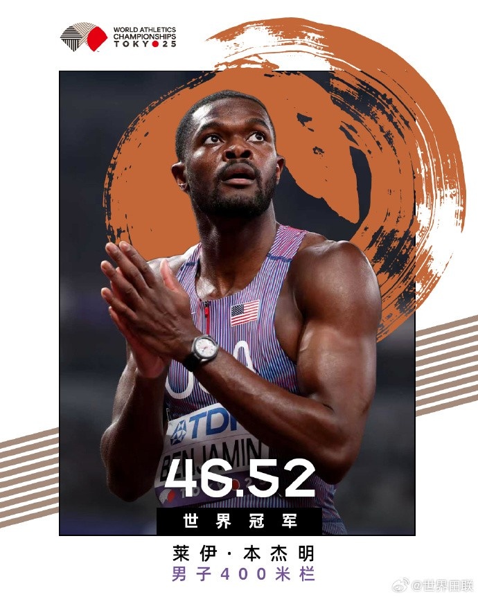 直播吧9月19日讯 2025年东京田径世锦赛男子400米栏决赛,在三巨头的又一次对决中,巴黎奥运会冠军本杰明跑出46秒52的赛季最佳夺冠,连续三届世锦赛收获奖牌之后终于夺金!