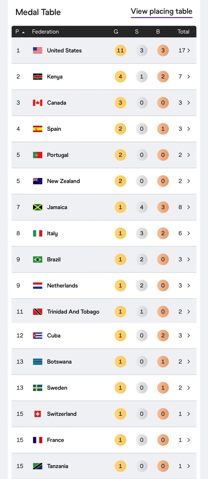 最新的世锦赛奖牌榜,美国11金3银3铜继续高居榜首,肯尼亚4金1银2铜第二。中国在女子链球(赵杰和张家乐)斩获1银1铜、在男子跳远(石雨豪)斩获铜牌、在男子20公里竞走(王朝朝)斩获银牌,2银2铜4块奖牌排第19。巴林1银1铜、韩国1银、东道主日本2铜、卡塔尔1铜上榜。