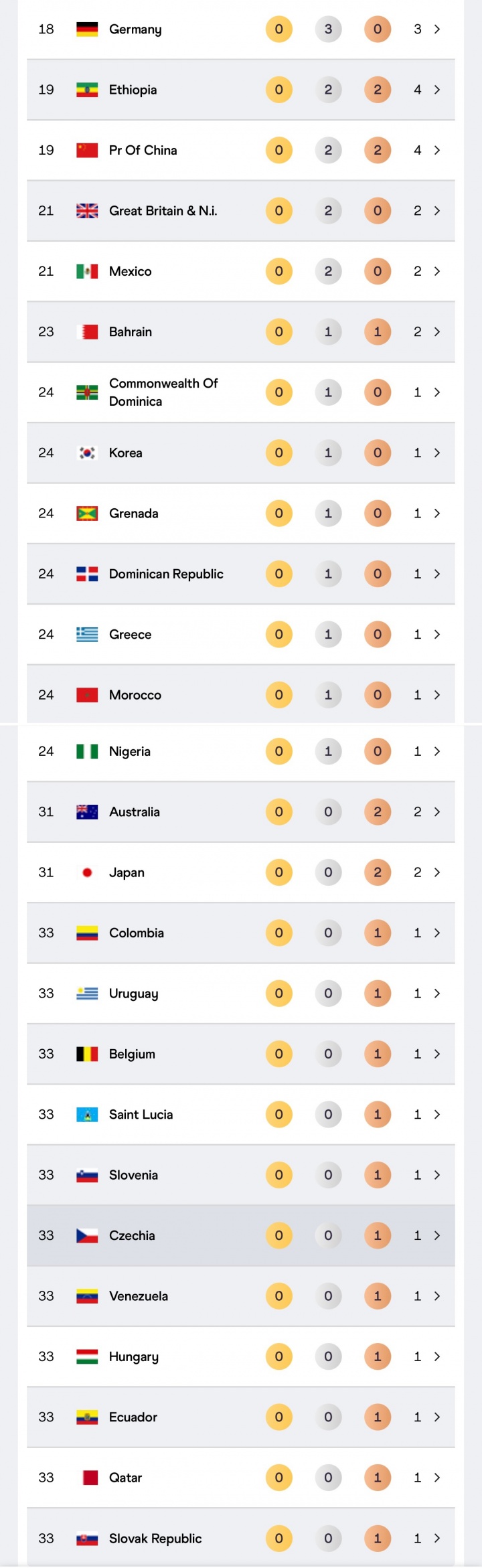 19、埃塞俄比亚,0金2银2铜,4块奖牌