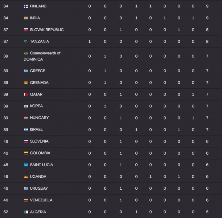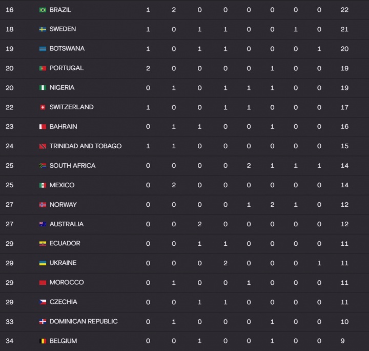 世锦赛官网更新名次得分表,夺得11金3银3铜的美国以220分断层领跑,4金1银2铜的肯尼亚和1金4银3铜的牙买加均是80分并列第2,2银2铜的中国48分排名第5,东道主日本29分第12、韩国7分第39。