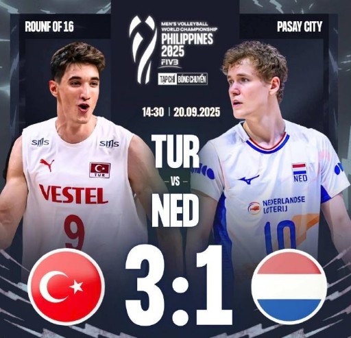 直播吧9月20日讯 9月20日菲律宾帕赛,2025男排世锦赛首场1/8决赛,土耳其3-1(27-29/25-23/25-16/25-19)击败荷兰,率先晋级八强,将与波兰和加拿大的胜者争夺四强席位。A-拉古姆齐亚28分、曼迪拉齐15分、M-拉古姆齐亚13分、布尔布尔12分,阿伊21分、库普斯14分。