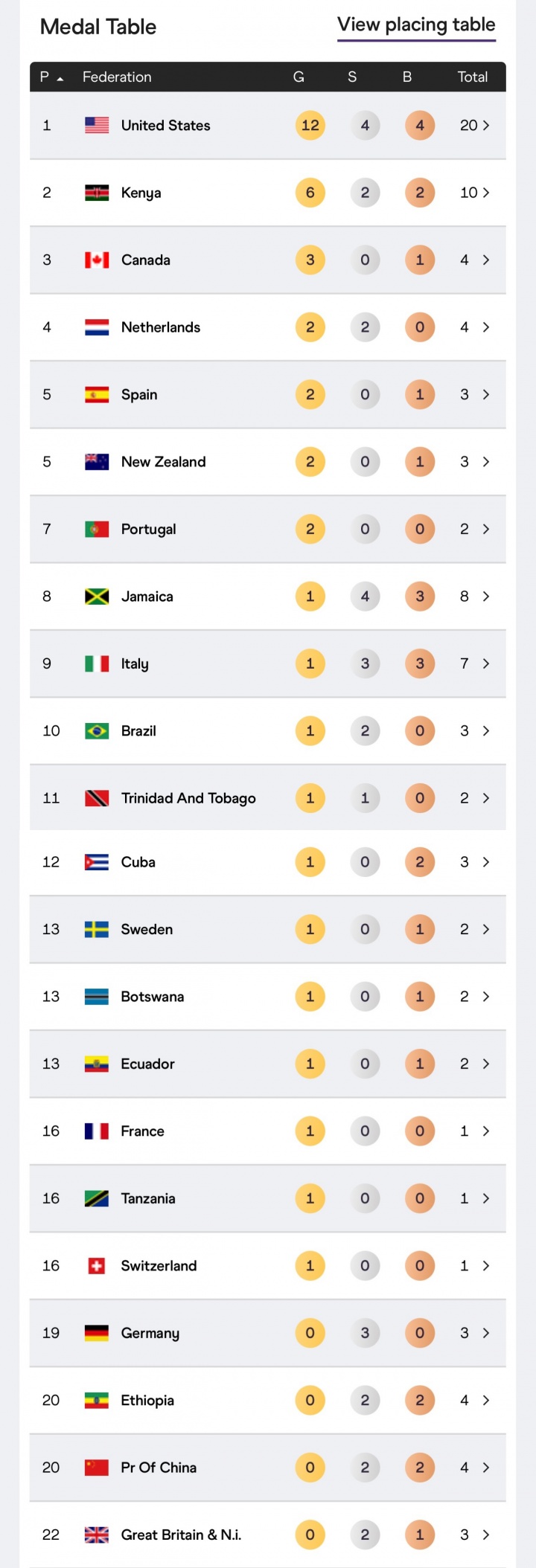 最新的世锦赛奖牌榜,美国12金4银4铜继续高居榜首,肯尼亚6金2银2铜第二。中国在女子链球(赵杰和张家乐)斩获1银1铜、在男子跳远(石雨豪)斩获铜牌、在男子20公里竞走(王朝朝)斩获银牌,2银2铜4块奖牌排第20。亚洲国家中,巴林1银1铜、韩国1银、东道主日本2铜、卡塔尔1铜上榜。